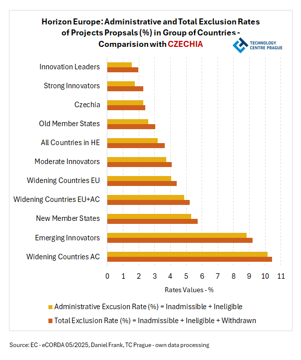 ČR si v této perspektivě vede velmi dobře. Z 1 835 podaných návrhů bylo 0,49 % označeno jako „inadmissible", 1,80 % jako „ineligible" a 0,11 % jako „witdrawn"; celková míra projektových návrhů, které skončily před branami expertního hodnocení tak činí 2,40 %, což je v porovnání s celkovou situací v programu Horizont Evropa (3,65 %) přijatelná hodnota. Lze konstatovat, že projektové návrhy českých žadatelů z velké části vyhovují formálním náležitostem a podmínkám účasti a jejich úroveň je v tomto ohledu srovnatelná, či dokonce převyšuje většinu ostatních států či skupin států.