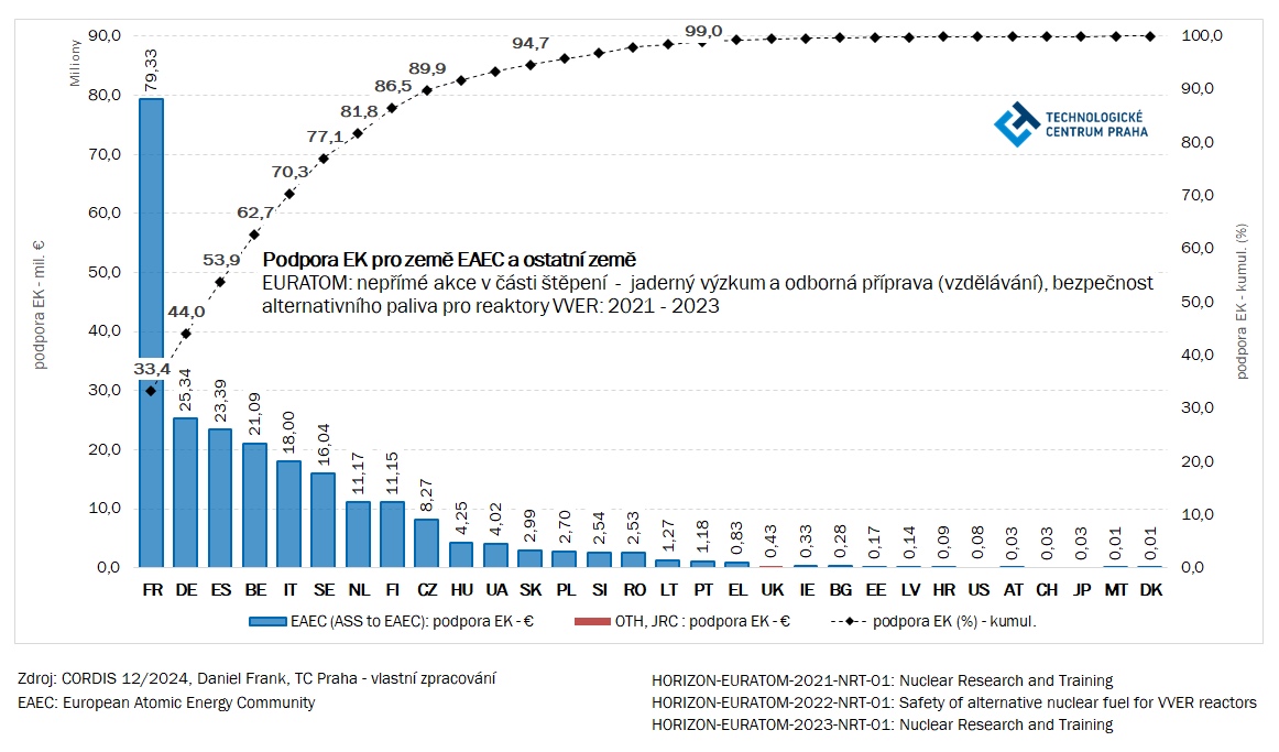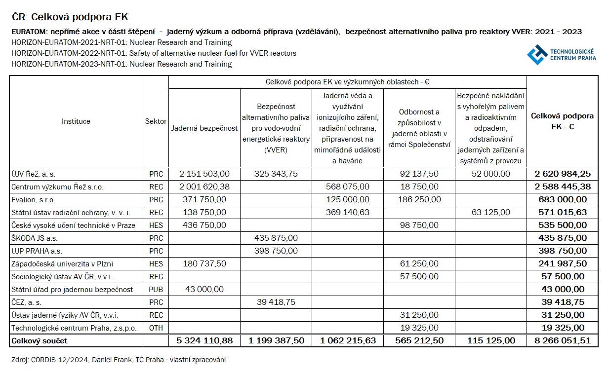 Prostřednictvím výše uvedených výzev bylo vybráno k financování 51 projektů, na jejichž řešení EK poskytla finanční podporu ve výši 238 mil. eur. Výzkumné instituce z ČR se účastní 30 projektů, tj. téměř 2/3 všech financovaných. Finanční podpora pro ČR z daných výzev programu Euratom dosáhla výše 8,3 mil. eur. Významné postavení ČR v programu Euratom dokládají její podíly účasti v tomto programu, které jsou násobně vyšší než v případě programu Horizont Evropa. Zatímco v programu Horizont Evropa tvoří české výzkumné týmy cca 1,4 % všech zúčastněných týmů, v programu Euratom (nepřímé akce, štěpení) je to 5,0 %. V programu Horizont Evropa překračuje podíl získané podpory pro ČR 1 % (přesněji 1, 12 %), v programu Euratom je tento podíl 3 x vyšší – 3, 5 %. V programu Horizont Evropa se ČR angažuje v 6 % financovaných projektů, v programu Euratom je to 10 x více – v 60 % projektů. Samozřejmě lze namítat, že programy Horizont Evropa a jeho kompletního partnera program Euratom nelze jednoduše porovnávat co do velikosti rozpočtu, rozsahu výzev a témat a počtu zúčastněných států, ale i tak je postavení ČR mezi 36 státy, které se účastní sledovaných výzev v programu Euratom významné.