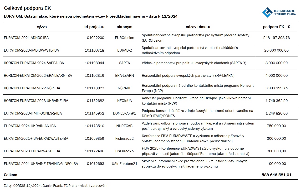 Součástí pracovního programu pro Euratom na roky 2023–2025 je ještě výzva HORIZON-EURATOM-2024-NRT-01, která se věnuje opatřením v oblasti energie z jaderné syntézy a budování kapacit pracovníků se specializovanými dovednostmi v jaderné a radiologické oblasti. Pro tuto malou výzvu, která předpokládá financování dvou projektů s celkovou podporou ve výši 3 miliony eur, však v uvedené databázi CORDIS zatím chybí podrobná data.