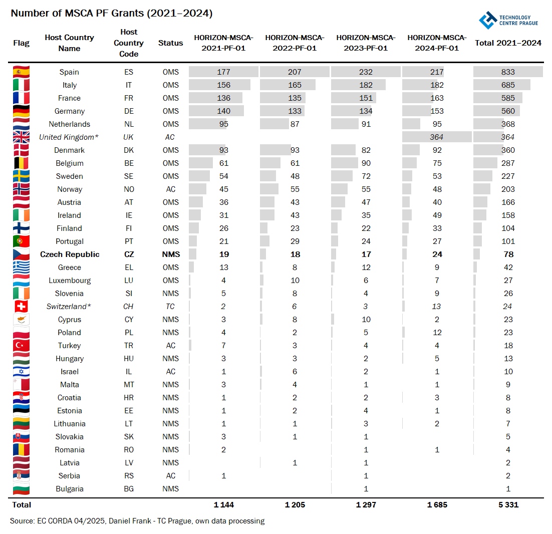 ∗Údaje za Spojené království a Švýcarsko jsou ovlivněny politickými okolnostmi, nikoliv nízkou vědeckou kvalitou těchto zemí. Spojené království: Po brexitu mělo omezený přístup k programu Horizont Evropa. Jako asociovaná země se plně připojilo až na začátku roku 2024. V letech 2021–2023 proto nemohlo koordinovat ani hostit projekty MSCA PF. Švýcarsko: Kvůli přerušení jednání s EU o bilaterálních dohodách bylo od roku 2021 označeno jako „třetí země“ (third country). Výzkumníci nemohli podávat návrhy MSCA PF s hostitelskou institucí ve Švýcarsku. Granty MSCA PF připisované Švýcarsku se týkají projektů realizovaných v Organizaci evropského jaderného výzkumu – CERN (Organisation Européenne pour la Recherche Nucléaire), která má status mezinárodní mezivládní organizace a není závislá na právním postavení Švýcarska v programu Horizont Evropa. EK umožňuje účast vybraným mezinárodním organizacím se sídlem ve třetích zemích, pokud splňují podmínky způsobilosti stanovené ve výzvě.