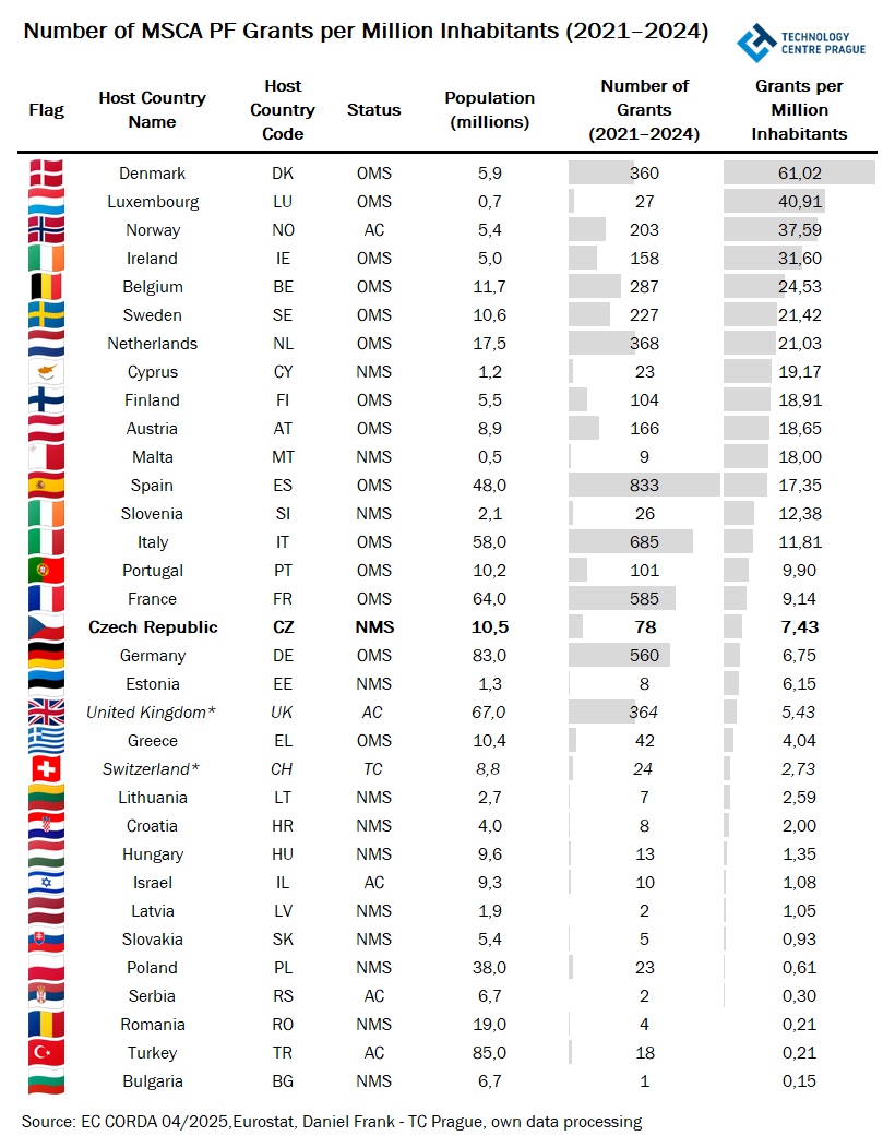 Zajímavým zjištěním při pohledu na relativní data je skutečnost, že ČR a Německo vykazují srovnatelný počet grantů MSCA PF přepočtený na milion obyvatel. Ačkoli Německo obdrželo v letech 2021–2024 téměř sedmkrát více těchto grantů v absolutních číslech (560 vs. 78), po zohlednění velikosti populace je rozdíl mezi oběma zeměmi překvapivě malý.