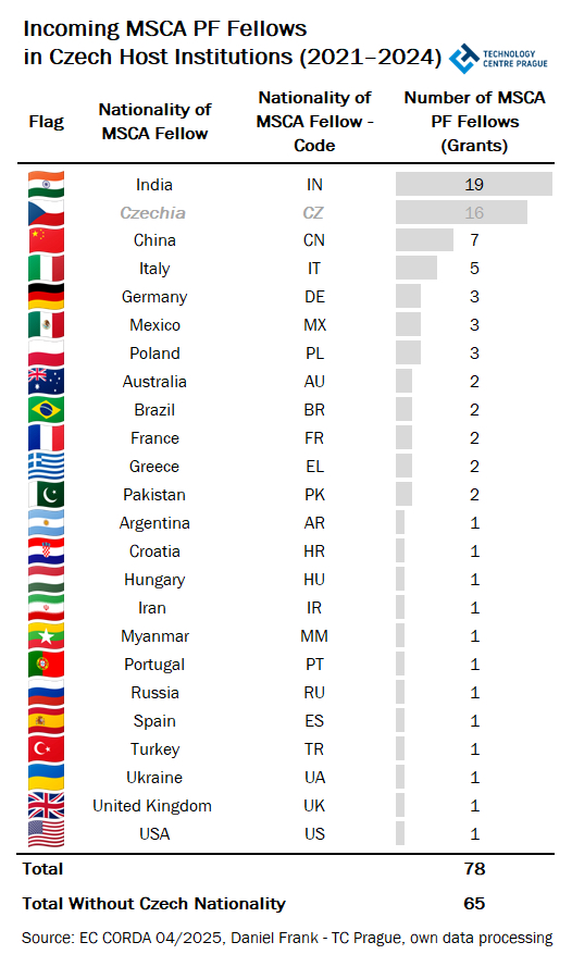 V českých hostitelských institucích řeší 62 grantů MSCA PF cizinci a 16 grantů domácí výzkumníci. Podíl zahraničních výzkumníků tak činí 79,5 %, což je mírně pod průměrem všech uvedených států (77,9 %). To znamená, že ČR je poměrně úspěšná v přitahování mladých zahraničních výzkumníků na svá výzkumná pracoviště. Mezi zahraničními stipendisty programu MSCA PF dominují výzkumníci z Indie s 19 granty MSCA PF. Indové tvoří téměř 31 % všech zahraničních výzkumníků v ČR v MSCA PF. Výrazné zastoupení má také Čína, Itálie a země Latinské Ameriky (Brazílie, Mexiko, Argentina). To ukazuje, že ČR je atraktivní zejména pro nadějné výzkumníky z mimoevropských zemí. Z evropských států jsou nejvíce zastoupeni výzkumnici z Itálie, Polska, Německa, Francie a Řecka, tedy zemí se silnou vědeckou komunitou a zároveň mobilitou vědců.