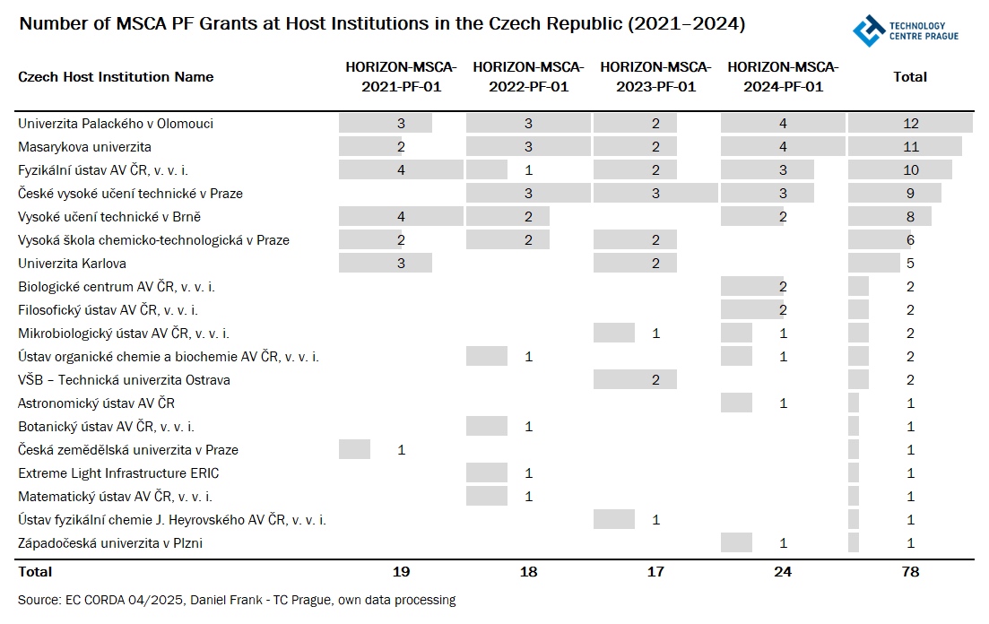 ČR je v období 2021–2024 hostitelskou zemí pro celkem 78 grantů MSCA PF. Tento počet ji řadí přibližně do středu mezi členskými státy EU. V absolutních číslech si ČR vede lépe než ostatní země střední a východní Evropy, ale stále zaostává za západními a severskými státy. Země s podobnou populační velikostí, jako je Belgie (287 grantů), Švédsko (227) nebo Rakousko (166), dosáhly podstatně lepších výsledků než ČR.