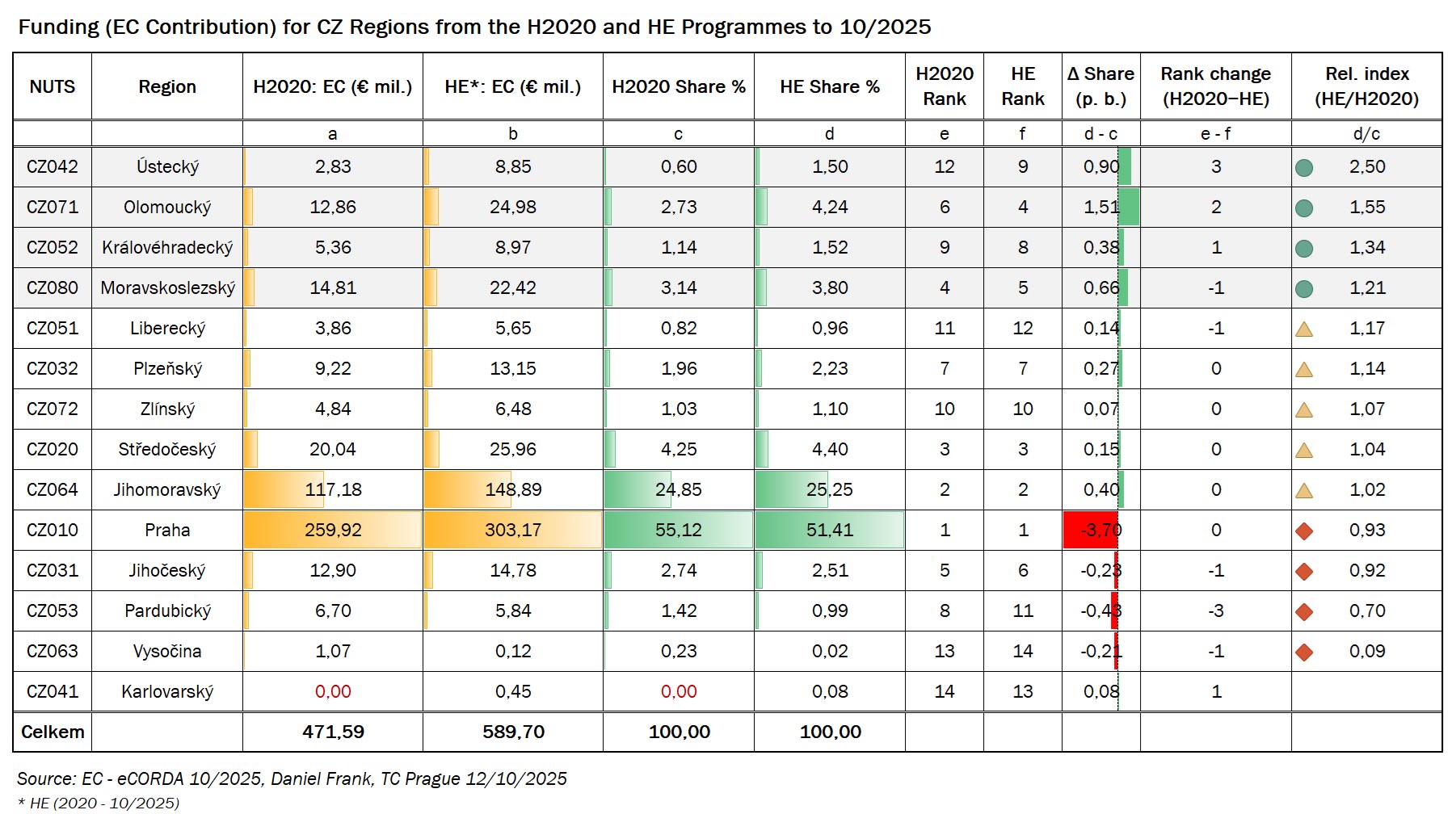 Hned za Ústeckým je Olomoucký kraj, který si výrazně polepšil: jeho podíl vzrostl zhruba o 1,51 p. b., v žebříčku se posunul ze 6. na 4. místo a relativní index 1,55 říká, že jeho podíl v HE je zhruba o polovinu vyšší než v programu H2020. Třetí největší relativní růst vykazuje Královéhradecký kraj – jeho podíl v HE vzrostl o 0,38 p. b., v žebříčku si polepšil z 9. na 8. místo a relativní index 1,34 znamená, že jeho podíl je zhruba o třetinu vyšší než v programu H2020. Moravskoslezský kraj rovněž posílil, a to o 0,66 p. b.; jeho relativní index 1,21 ukazuje na zhruba pětinové zvýšení podílu oproti programu H2020. V pořadí krajů však mírně klesl (z 4. na 5. místo), protože několik dalších regionů — zejména Olomoucký a Ústecký — rostlo ještě rychleji.