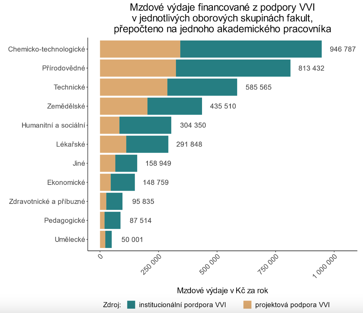 V přepočtu na jednoho akademického pracovníka směřovalo na chemicko-technologické fakulty třikrát více mzdových prostředků z podpory VVI než na humanitní a sociální fakulty, jedenáctkrát více než na pedagogické fakulty a téměř dvacetkrát více než na umělecké fakulty. Výzkumníci v různých oborech tak rozhodně nemají stejnou šanci si „sáhnout“ na prostředky z VVI.