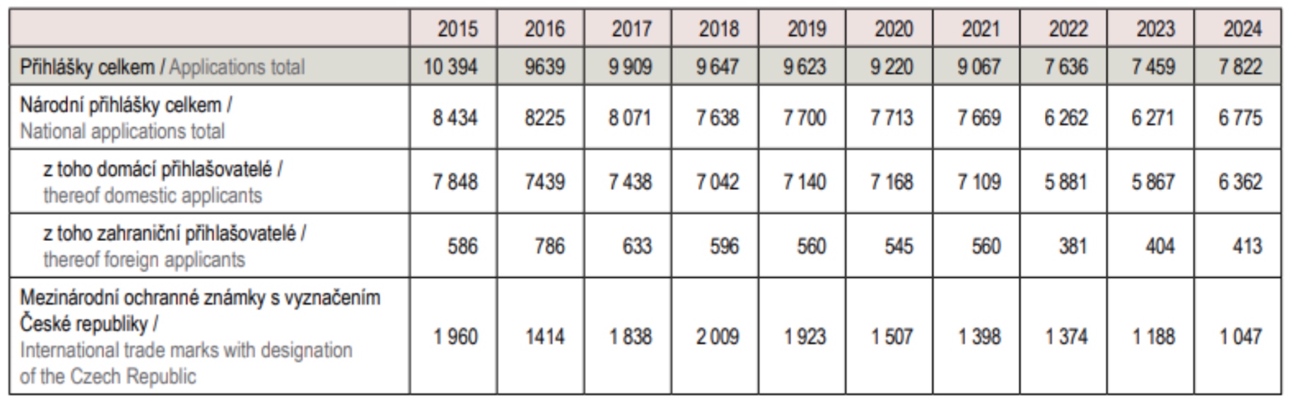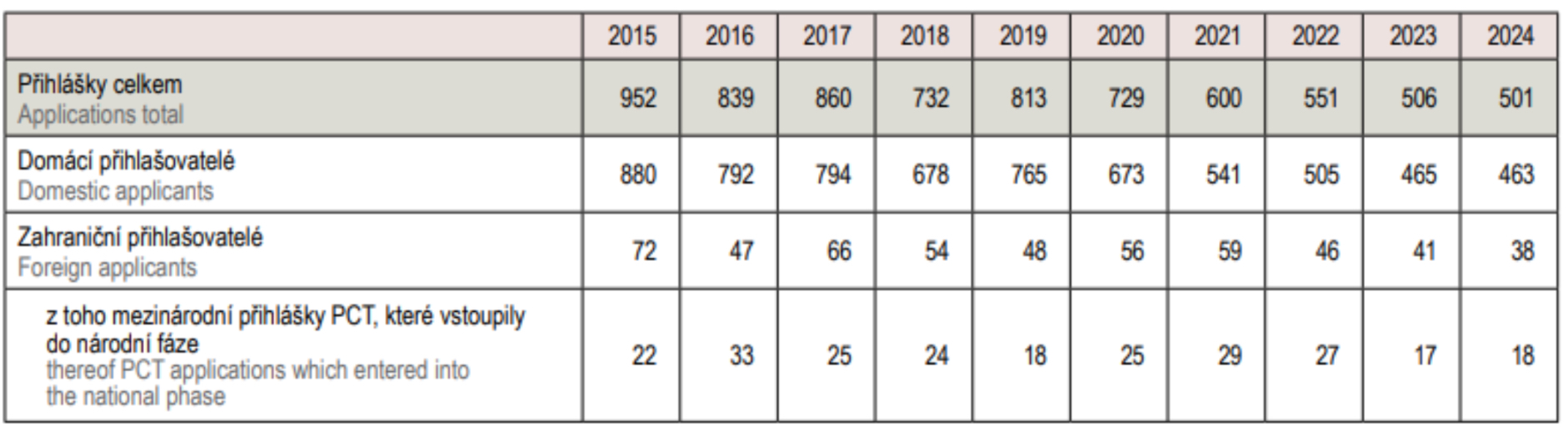 Abyste měli možnost pocítit, v jakém rytmu se ochrana duševního, resp. zejména průmyslového vlastnictví pohybuje v České republice, přinášíme na následujících řádcích informace o počtech přihlášek a registrovaných práv v minulém roce. Údaje vycházejí z Výroční zprávy Úřadu průmyslového vlastnictví za rok 2024, která byla nedávno zveřejněna.
