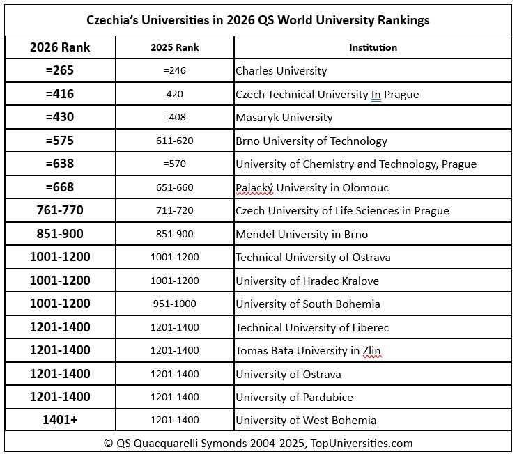České vysoké školství zaostává v konkurenceschopnosti nejen za světem, ale i regionálními konkurenty, upozorňuje nejnovější vydání žebříčku QS World University Rankings 2026. Žebříček zahrnuje 16 českých institucí, jen dvě si polepšily, především VUT v Brně, sedm si dokonce pohoršilo. Naproti tomu regionální konkurenti jako Maďarsko, Polsko a Rumunsko zaznamenali zlepšení u více než 30 % svých univerzit.