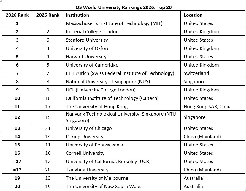 Celosvětově se zatím na špici drží americké univerzity, již po čtrnácté v řadě je na prvním místě americký Massachusets Institute of Technology (MIT). Na druhém místě pak Imperial College London ve Velké Británii a na třetím místě Stanford University z USA.