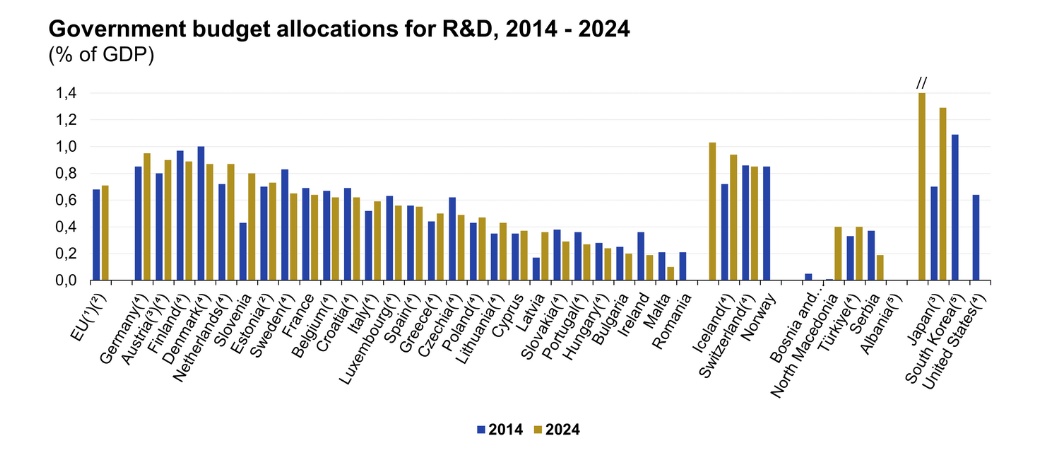 Evropská unie za poslední dekádu výrazně navýšila rozpočtové prostředky určené na výzkum a vývoj. Podle dat Eurostatu se mezi lety 2014 a 2024 zvýšily národní rozpočtové alokace členských států o 59,5 %, a to na odhadovaných 127,9 miliardy eur. Výdaje na výzkum a vývoj však v Česku v poměru k HDP klesají.