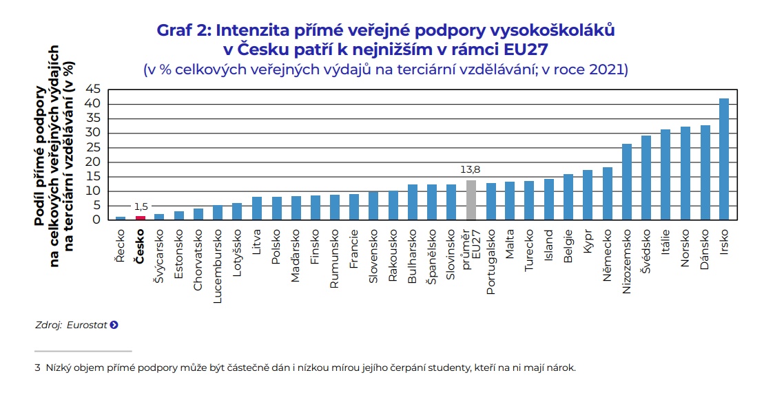 Hlavní slabinou českého systému finanční podpory vysokoškolských studentů je extrémně nízká úroveň přímé finanční podpory a velmi plošná nepřímá podpora přes rodiče, která necílí na ty, kdo ji nejvíce potřebují. Nepřímá podpora je poskytována převážně prostřednictvím daňových úlev rodičům. Přímá podpora je poskytována přímo studentům, na rozdíl od nepřímých podpor skrze rodiče nebo slevy. Intenzitou, tedy podílem přímé veřejné finanční podpory na celkových veřejných výdajích na terciární vzdělávání, je Česko hned po Řecku druhé na úrovni pouhých 1,5 %, zatímco průměr zemí EU27 na úrovni 13,8 % je násobně vyšší (Graf 2, uvedený výše). Většina forem podpory navíc končí skokově, například při dosažení 26 let věku, přestože mnoho studentů dnes studuje i déle.