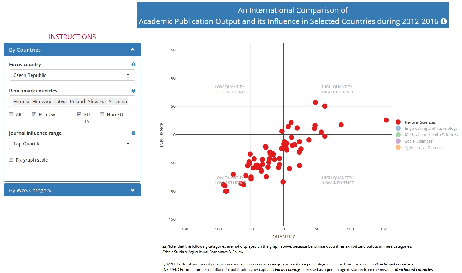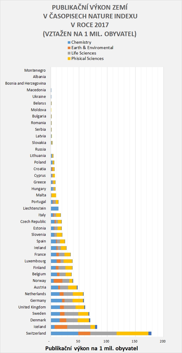 Česká republika je v něm s celkem 184 publikovanými články (za období 12 měsíců) na solidním 15. místě za dalšími zeměmi EU (kromě Swiss) ze zhruba 40 evropských zemí. Nejvyššího publikačního výkonu dosahuje Německo s 4 238 články. To je ale mnohem větší než Česko, stejně jako jsou větší Polsko a Rusko, které jsou v tabulce také před námi. Ale třeba Švýcarsko, které menší než Česko je, má publikační výkon mnohem větší. Publikační výkon v tabulce prostě nezohledňuje, jak jsou země velké (populace). Přepočet výkonu na milion obyvatel si už člověk musí udělat sám - v Grafu 1. Dokonce lze rozlišit strukturu podle několika základních podoborů přírodních věd.