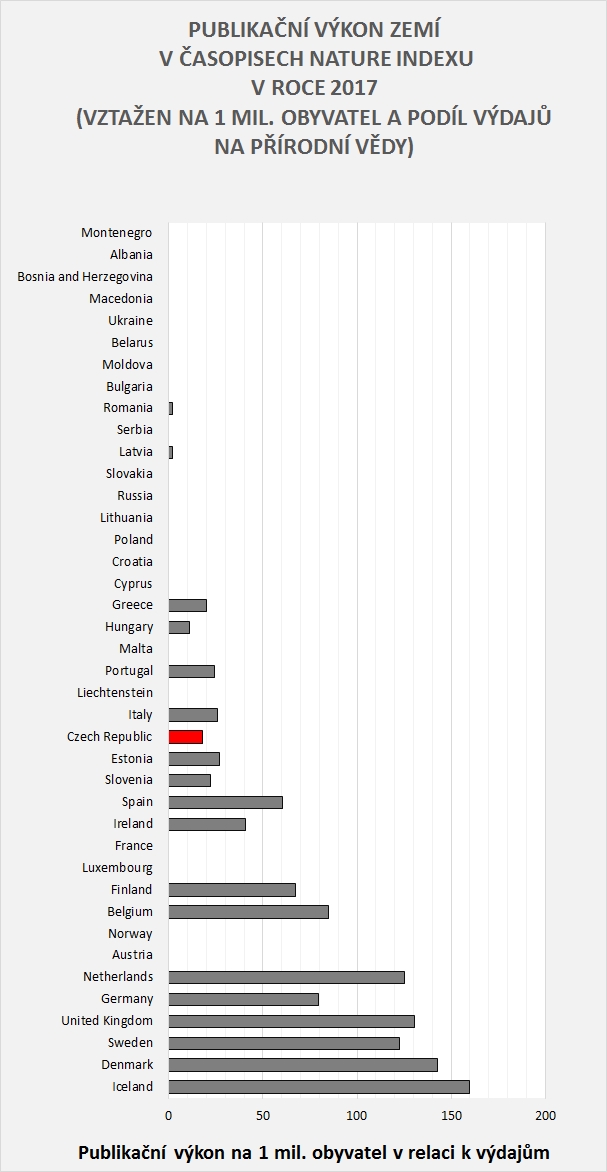 Pokud se však zohlední velikost zemí, poklesne Česko na místo 18. A pokud se navíc zohlední i vysoký podíl veřejných výdajů na přírodní vědy v Česku, spadneme až někam na 20. místo v rámci osmadvacítky EU. To už tak solidní není. A je to důvod k zamyšlení, protože z ostatních věd jsme v přírodních vědách relativně nejlepší.