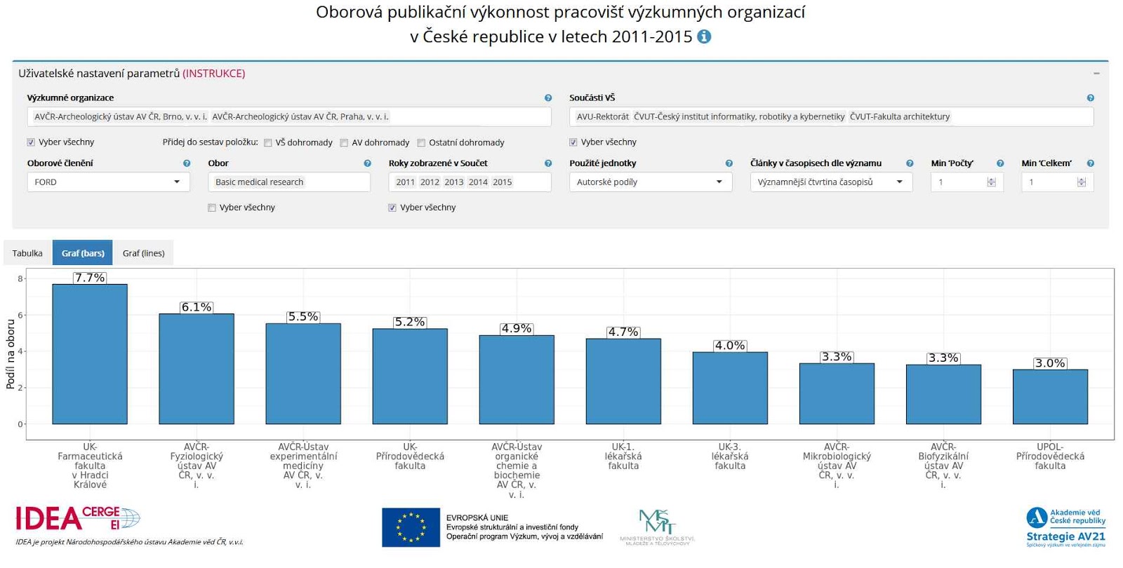 Takto níže tedy vypadá tabulka z jedné bibliometrické zprávy, která ukazuje organizace s nejvyššími publikačními podíly ve vědecky nejvlivnější čtvrtině časopisů v oboru Basic Medicine (řazeno podle hodnoty jejich AIS). Peleton s velkým náskokem 24 % vede Univerzita Karlova, za ní pak s odstupem Masarykova Univerzita s 9 %.