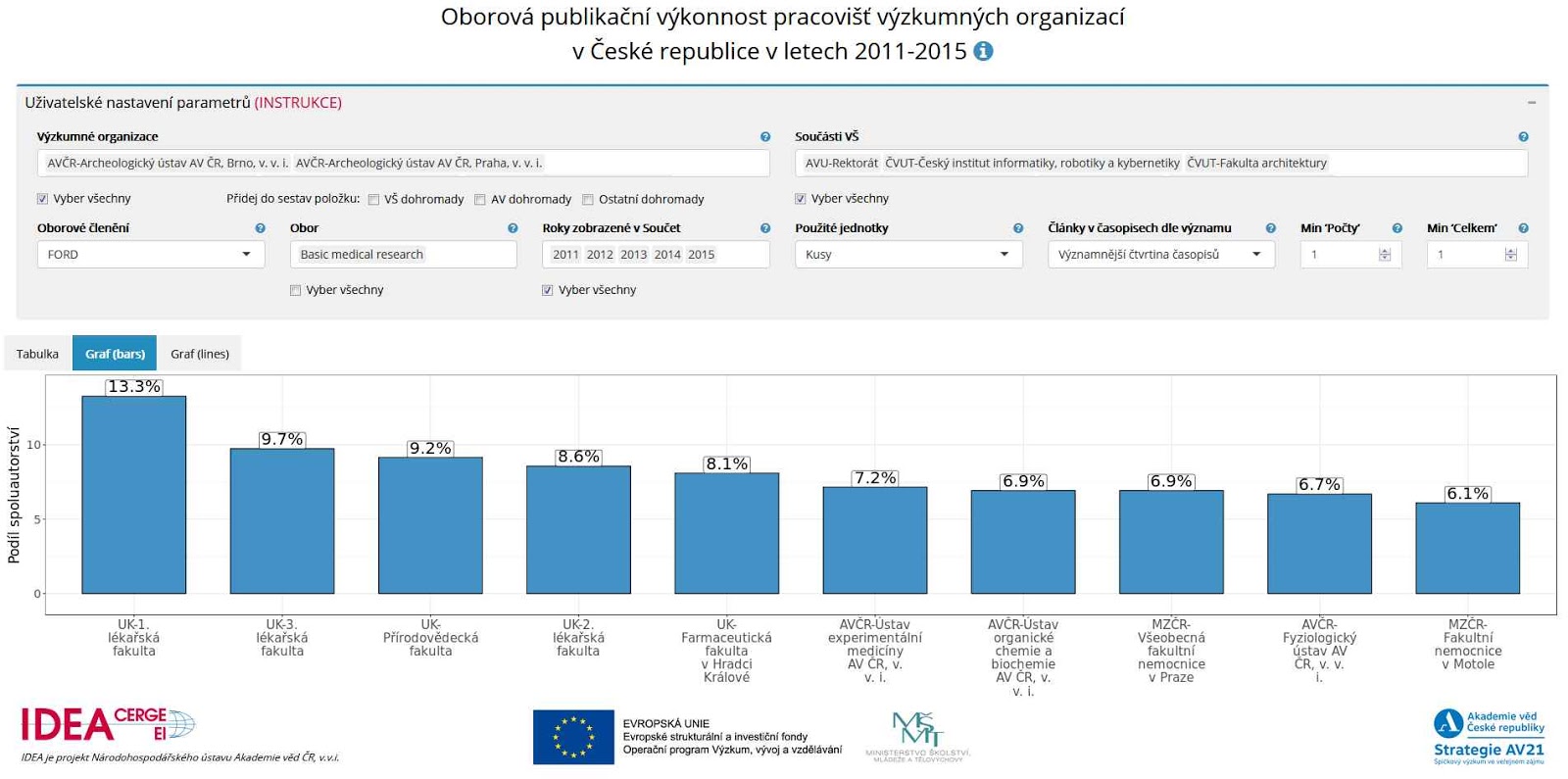 Citlivost výsledků na spoluautorství ale umožňuje vysledovat web aplikace IDEA (připravuje se její zveřejnění). Odlišnosti údajů v ní od vládních bibliometrických zpráv jsou dány hlavně jiným obdobím (2011-2015), než za které jsou zprávy (2016). Následující Graf A ukazuje, na jakém podílu všech článků s českým autorem se jednotlivá pracoviště podílela. V extrémním případě může být podíl každého z pracovišť 100 %. Jde o ukazatel blízký tomu v tabulce výše. V tomto srovnání vykazuje nejvyšší podíl na publikačním výkonu 13,3 % 1. Lékařská fakulta Univerzity Karlovy následovaná dalšími fakultami téže univerzity.