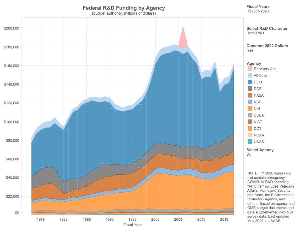 Pro kontext: Nejvíce státních fondů na vědu a výzkum tradičně protéká (rok 2024, v miliardách dolarů): ministerstvem obrany (90,6), ministerstvem zdravotnictví (47,6), ministerstvem energie (22,2), NASA (11,8), Národní vědeckou nadací (NSF, 7,8) a ministerstvem obchodu (3,9), pod nějž spadá NOAA, čili Národní agentura pro výzkum oceánů a atmosféry. V tomto článku se zaměřím hlavně na biolékařský výzkum pod hlavičkou Národních ústavů zdraví (National Institutes of Health, NIH) při ministerstvu zdravotnictví; o vývoji v dalších resortech se zmíním stručněji.