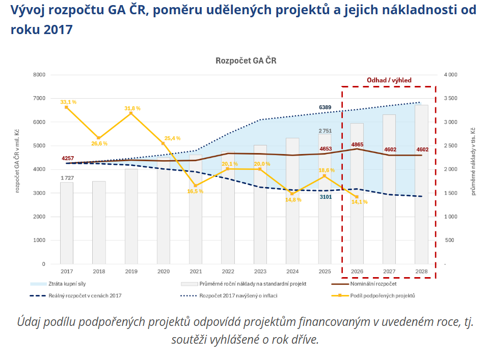 Agentura se s ohledem na reálnou kupní sílu potýká se snižováním rozpočtu už téměř 10 let a rozpočtový výhled naznačuje, že tento negativní trend má pokračovat. Zjednodušeně řečeno, aby letošní rozpočet GA ČR odpovídal kupní síle roku 2017, musel by být vyšší o přibližně 1,7 miliardy Kč, tedy o více než jednu třetinu. Takový rozpočet by mohl zajistit financování většině excelentních výzkumných projektů.