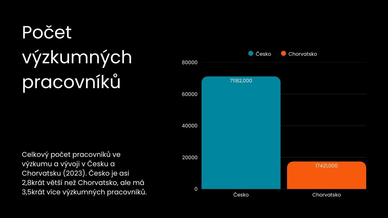 Chorvatsko má přibližně 3,5krát méně výzkumných pracovníků než Česká republika, ačkoli jeho populace je pouze 2,8krát menší. To naznačuje, že vědecká kariéra v Chorvatsku stále není dostatečně atraktivní. Zajímavé je srovnání zapojení obou zemí do programu Horizont Evropa, kde Chorvatsko jen zřídka vystupuje jako hlavní řešitel projektů. To může odrážet nedostatečnou kapacitu pro podávání žádostí nebo absenci excelentních projektů aplikovaného výzkumu, ale při znalosti chorvatské vědy bych zdůraznil to první. To se naštěstí pravděpodobně změní, protože EU klade větší důraz na zázemí pro země rozšíření, jako je Chorvatsko.