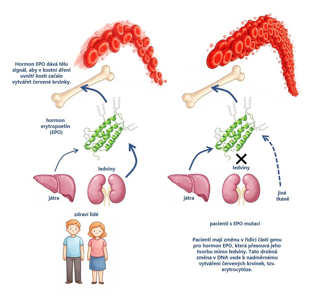 Úvodní grafika: Vzácná dědičná mutace v regulační oblasti genu pro EPO může způsobit přesun produkce hormonu mimo ledviny, měnit jeho biochemické vlastnosti a vést ke zvýšené tvorbě červených krvinek a rozvoji erytrocytózy (nadbytek červených krvinek) | Autorka: Lucie Láníková, IMG