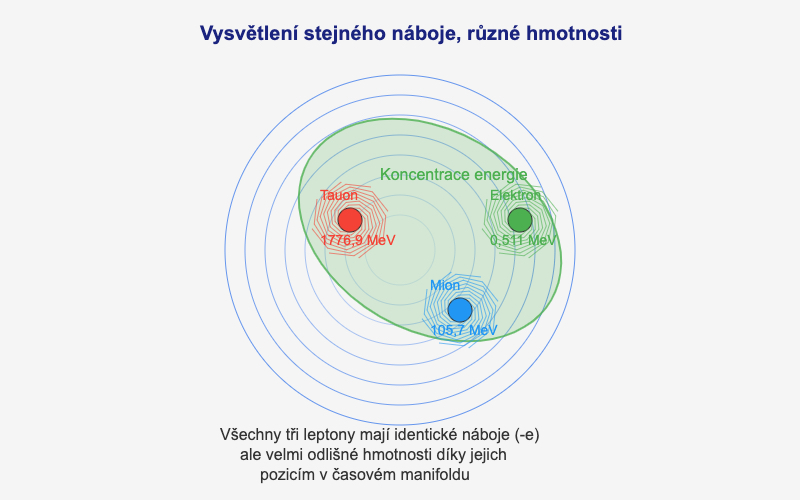 Díky tomuto modelu je náboj definován jako tzv. časové vinutí – topologický invariant, který je výsledkem zakřivení časového prostoru. Tento koncept přirozeně vysvětluje, proč částice napříč třemi generacemi nesou stejné náboje navzdory rozdílným hmotnostem. Elektrický náboj se totiž vztahuje k topologickým vlastnostem časoprostoru, zatímco hmotnost je určena vlastnostmi vlnové rovnice definované v tomto více časovém kontinuu.