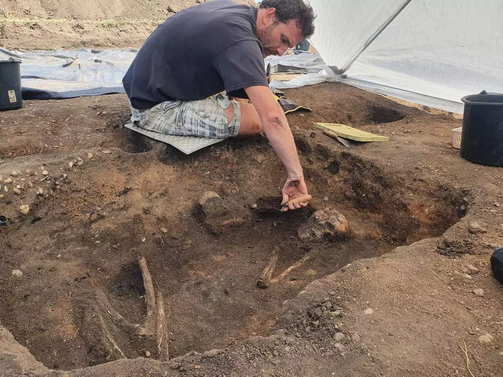 Petr Krištuf ze Západočeské univerzity v Plzni při odkrývání eneolitického pohřbu v mohyle u Račiněvsi. Foto: Martin Mykiska