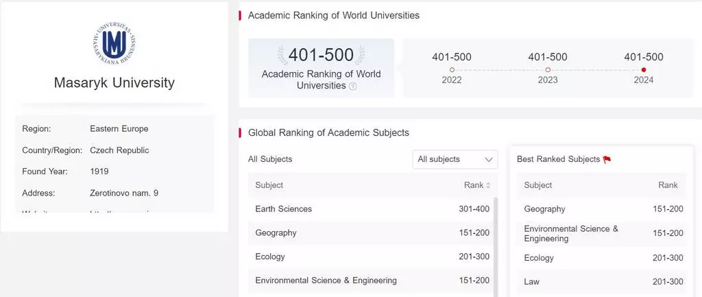 Následuje Masarykova univerzita na 401.–500. pozici, kterou neopouští od roku 2022, kdy poskočila z předchozího 601.–700. místa. „Vedle opětovného získání světové pozice v TOP 500 mě zejména velmi těší fakt, že ve třech z posuzovaných ukazatelů Masarykova univerzita obdržela pro letošní hodnocení vyšší bodové skóre oproti minulému roku. Lepších výsledků dosáhla v obou indikátorech spjatých s publikační činností, tedy v počtu publikací v časopisech Nature a Science a v počtu publikací indexovaných na Web of Science, rovněž pak v indikátoru hodnotícím vědecký výkon v přepočtu na akademického pracovníka. Vědecký výkon a zejména kvalita vědy nám tak v měřítku světové konkurence roste, a to je pro naši univerzitu, která cílí na vědeckou excelenci, výborná zpráva,“ uvádí k letošnímu vydání Šanghajského žebříčku Martin Bareš, rektor Masarykovy univerzity.