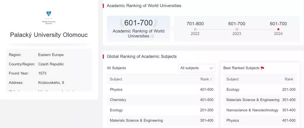 Univerzita Palackého v Olomouci loni poskočila o sto míst vzhůru na 601.–700. pozici, kde se udržela i letos.