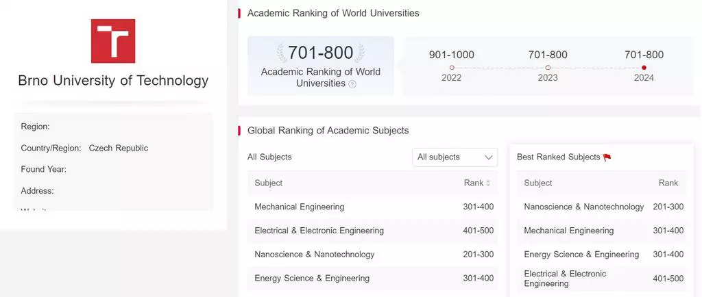 Stejné umístění z předchozího roku si drží také Vysoké učení technické v Brně, tedy 701.–800. příčku.