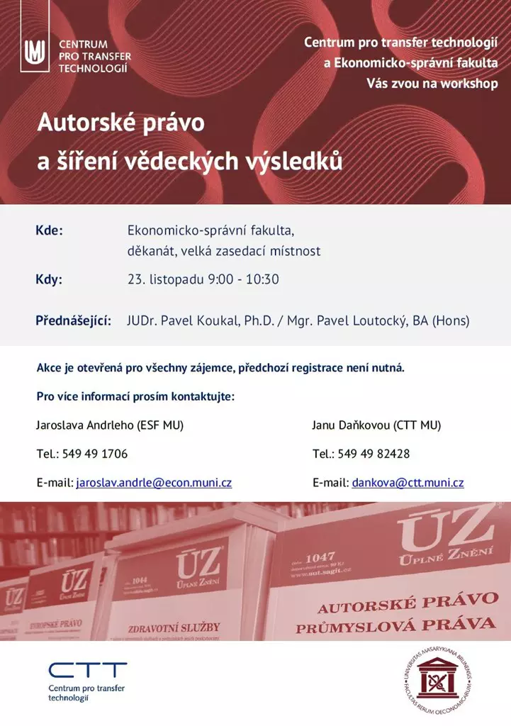Centrum pro transfer technologií a Ekonomicko-správní fakulta Masarykovy univerzity chystají workshop na téma "Autorské právo a šíření vědeckých výsledků".