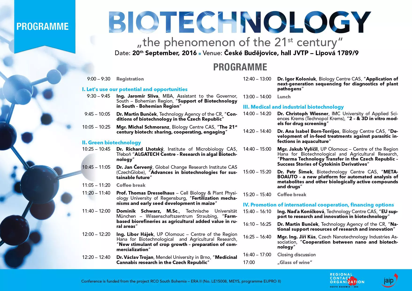 Konference se bude konat 20. září 2016 v prostorách Jihočeského vědeckotechnického parku, Lipová 1789/9 v Českých Budějovicích. Cílem akce je podpořit mezinárodní a mezisektorovou vědecko - výzkumnou spolupráci v oblasti biotechnologií.