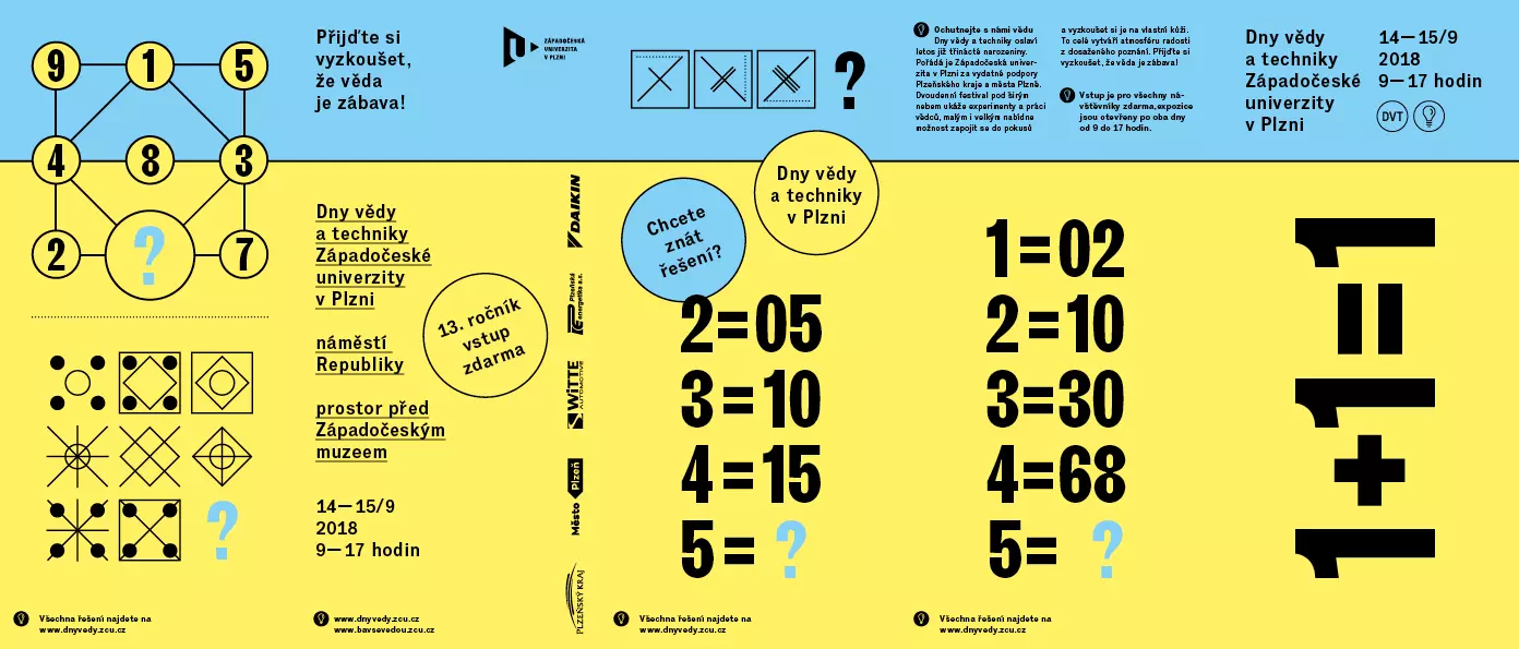 Od pátku 14. do soboty 15. září 2018 bude plzeňské náměstí Republiky a prostor před Západočeským muzeem patřit vědě a technice. Už potřinácté se tu uskuteční Dny vědy a techniky Západočeské univerzity v Plzni, které promění náměstí ve vědeckou laboratoř s 32 interaktivními expozicemi.