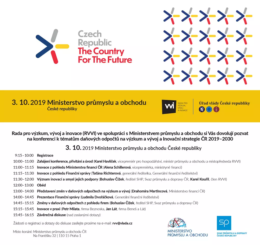 Rada pro výzkum, vývoj a inovace (RVVI) ve spolupráci s Ministerstvem průmyslu a obchodu ČR pořádají 3. října 2019 v Praze v prostorách MPO konferenci k tématům: daňové odpočty na výzkum a vývoj a Inovační strategie ČR 2019–2030.