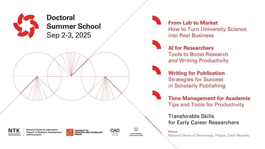 Národní technická knihovna zve všechny začínající výzkumníky na čtvrtý ročník letní doktorské školy, která se koná 2.–3. 9. 2025 v Praze. Jejím cílem je prostřednictvím workshopů zlepšit dovednosti výzkumníků na začátku jejich kariéry.