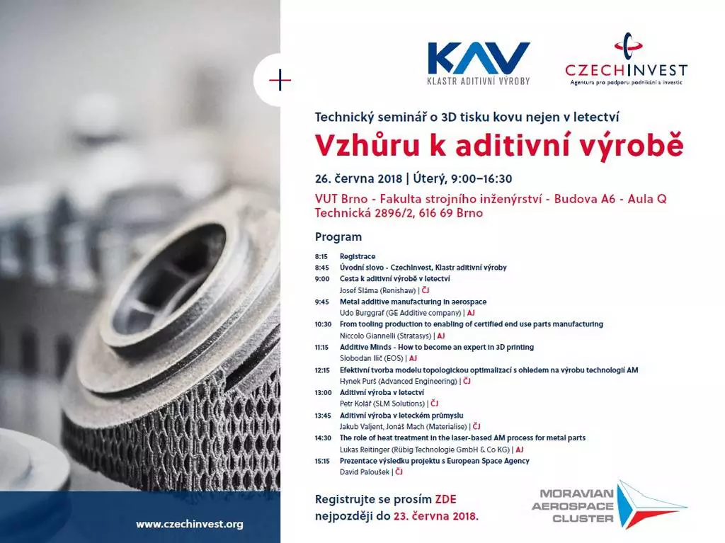 Akce, která je zaměřena na využití aditivní výroby v letectví se uskuteční pod záštitou Klastru aditivní výroby a agentury CzechInvest. Registrace probíhá on-line přes web. Kapacita akce je 150 lidí.