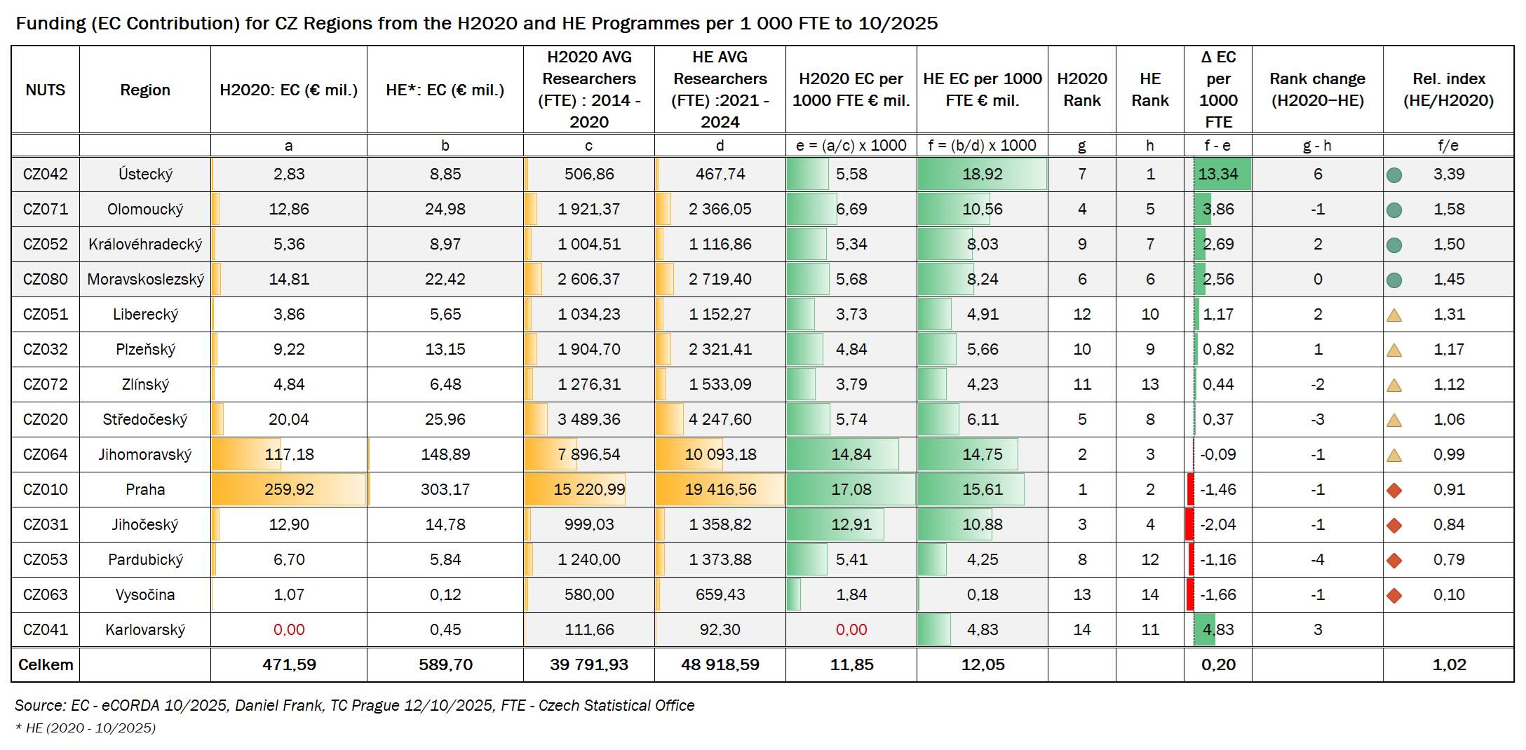 Hned za Ústeckým je Olomoucký kraj, který si výrazně polepšil: jeho podíl vzrostl zhruba o 1,51 p. b., v žebříčku se posunul ze 6. na 4. místo a relativní index 1,55 říká, že jeho podíl v HE je zhruba o polovinu vyšší než v programu H2020. Třetí největší relativní růst vykazuje Královéhradecký kraj – jeho podíl v HE vzrostl o 0,38 p. b., v žebříčku si polepšil z 9. na 8. místo a relativní index 1,34 znamená, že jeho podíl je zhruba o třetinu vyšší než v programu H2020. Moravskoslezský kraj rovněž posílil, a to o 0,66 p. b.; jeho relativní index 1,21 ukazuje na zhruba pětinové zvýšení podílu oproti programu H2020. V pořadí krajů však mírně klesl (z 4. na 5. místo), protože několik dalších regionů — zejména Olomoucký a Ústecký — rostlo ještě rychleji.