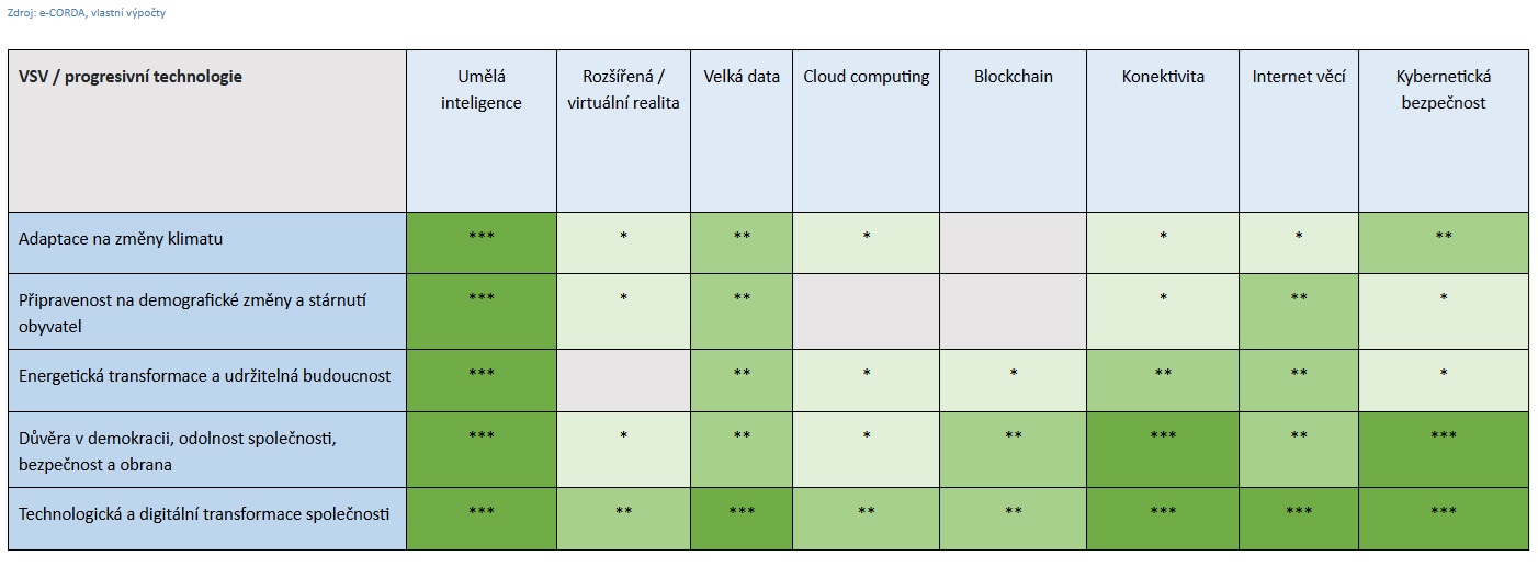 Z tabulky vyplývá, že nejvyšší příspěvek mají technologie založené na umělé inteligenci, které se využívají v projektech zaměřených na problematiku všech VSV. Vysoké uplatnění má také kybernetická bezpečnost ve VSV Technologická a digitální transformace společnosti a Důvěra v demokracii, odolnost, bezpečnost a obrana, což souvisí s vzrůstajícím počtem kybernetických útoků. Podobně je tomu i v případě konektivity. Široké uplatnění mají technologie využívající velká data, které mohou přispět k řešení všech identifikovaných výzev. Techniky využívající velká data se stále více uplatňují v řadě technologických oblastí a ekonomických odvětví. Také internet věcí má středně vysoký příspěvek pro řešení problematiky několika VSV, což zřejmě souvisí s tím, že technologická zařízení spolu vzájemně komunikují.