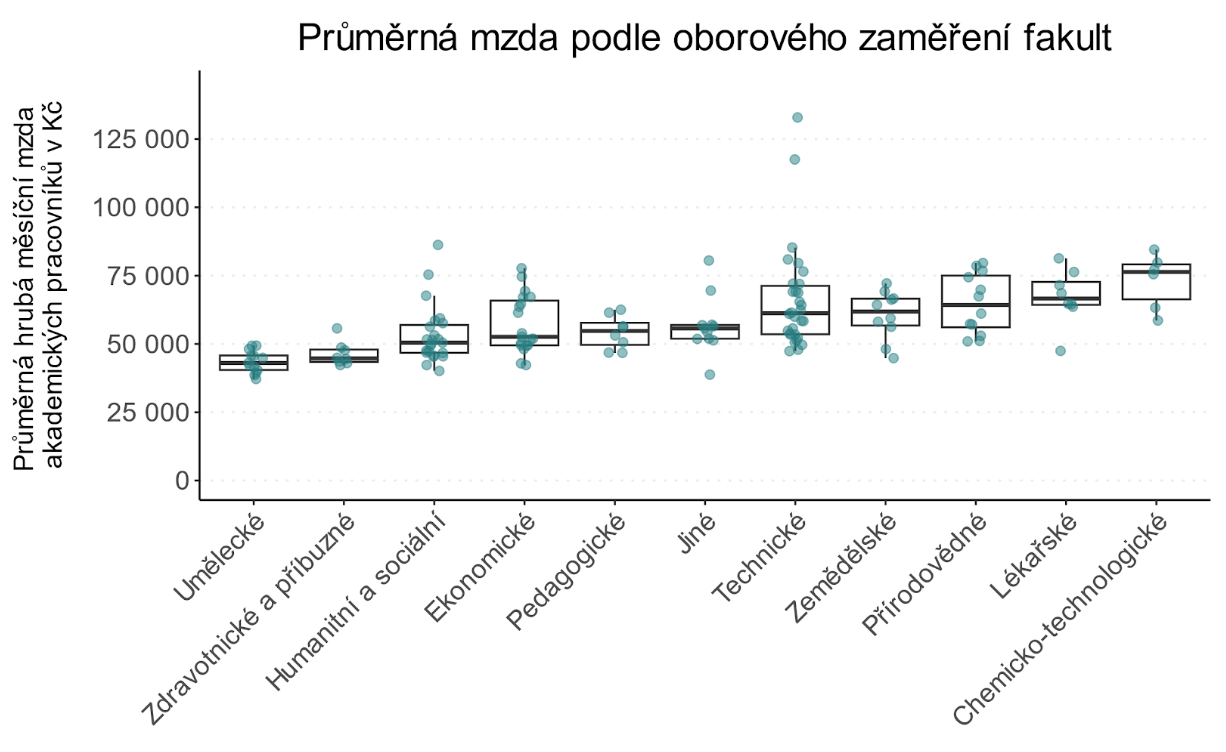 Průměrná hrubá mzda na jednotlivých fakultách se v roce 2022 pohybovala od 37 tis. Kč až po 133 tis. Kč. Mzdy se přitom lišily mezi jednotlivými oborovými skupinami. Nejmenší byly v průměru na zdravotnických (nelékařských) a především na uměleckých fakultách, nejvyšší naopak na chemicko-technologických, lékařských a přírodovědeckých fakultách. I v rámci jednotlivých skupin ale existovaly propastné rozdíly.