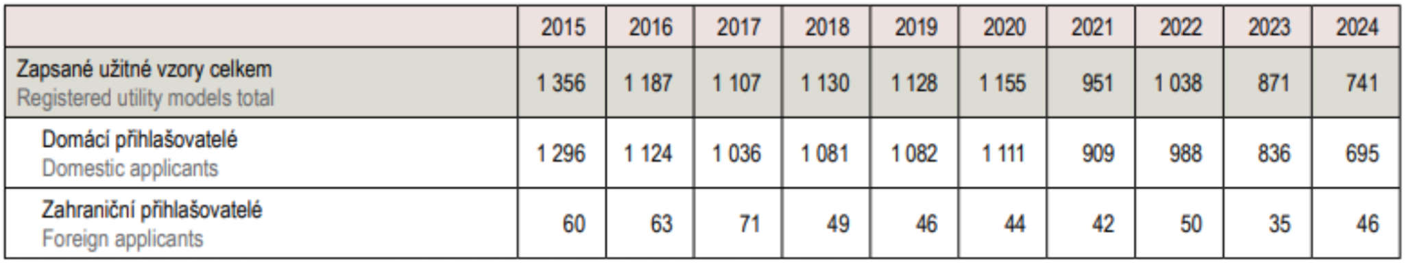 Úřad zapsal v roce 2024 do rejstříku 741 užitných vzorů. Celkový počet zapsaných užitných vzorů platných na území ČR na konci roku 2024 činil 6 016.