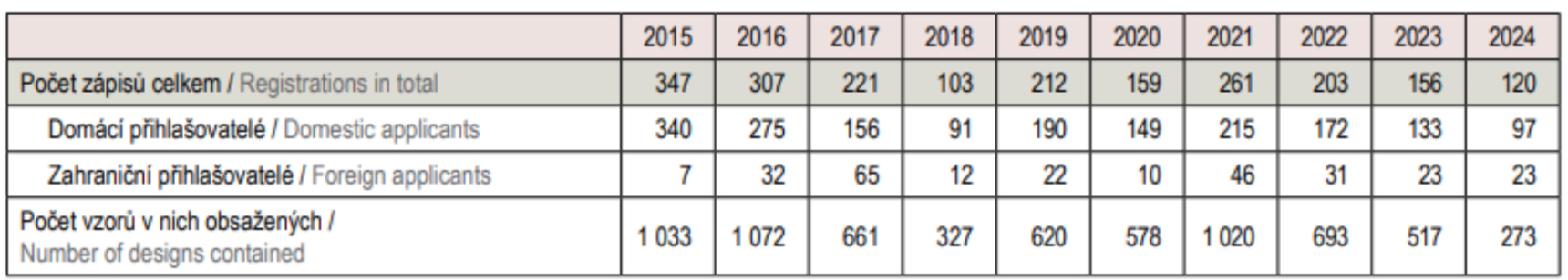 V roce 2024 bylo v ČR podáno 167 přihlášek průmyslových vzorů, které obsahovaly celkem 376 designérských řešení. Podané žádosti většinou pocházely od domácích přihlašovatelů. Nejvíce jich bylo v oblasti hodin a měřicích přístrojů, nábytku, dopravních prostředků a svítidel. V témže roce provedl Úřad 120 zápisů do rejstříku průmyslových vzorů, které obsahovaly 273 designérských řešení. Z toho bylo 97 zápisů provedeno ve prospěch domácích přihlašovatelů a 23 zápisů ve prospěch přihlašovatelů zahraničních.