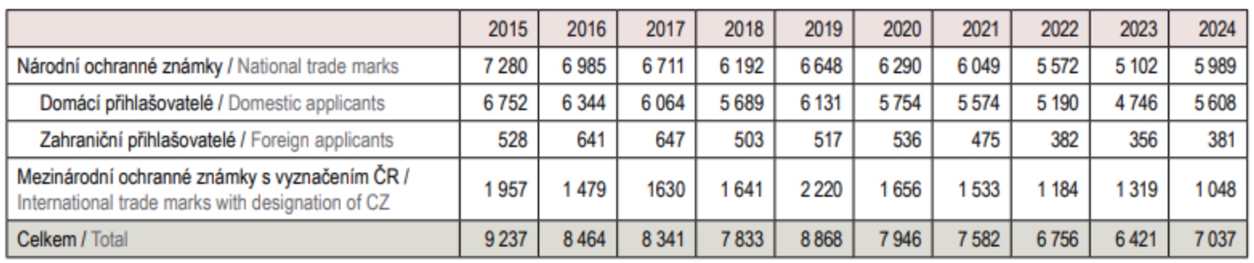 V roce 2024 bylo u Úřadu podáno celkem 6 775 přihlášek národních ochranných známek, z toho 6 362 domácími subjekty a 413 přihlašovateli ze zahraničí. Úřad zapsal do rejstříku 5 989 národních ochranných známek, z nich 5 608 českým a 381 zahraničním subjektům.