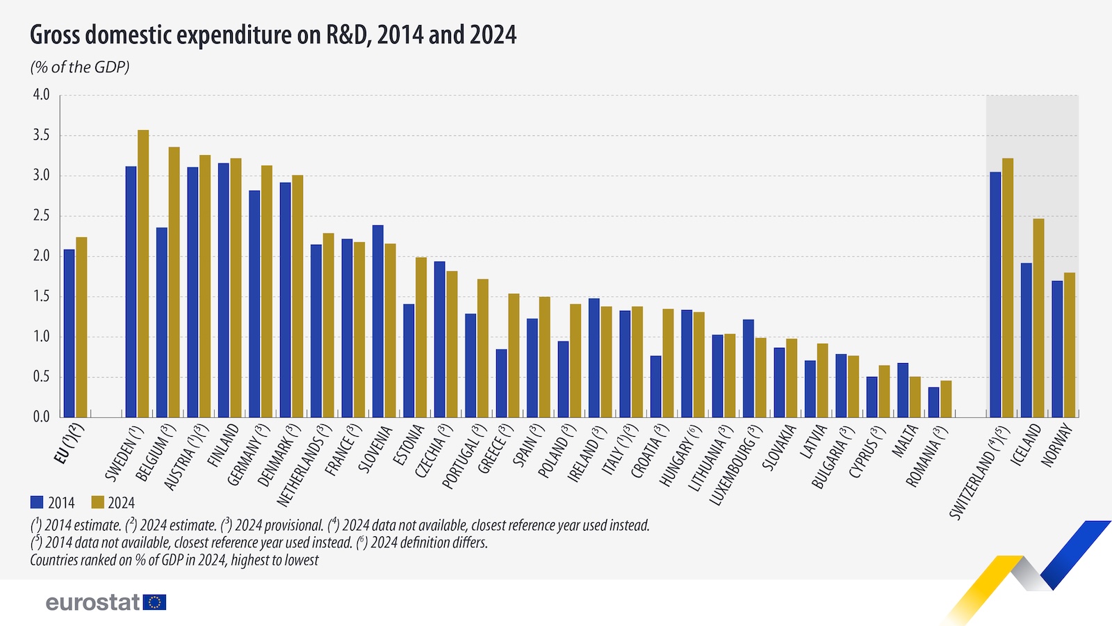 V roce 2024 zaznamenalo 6 zemí EU intenzitu výzkumu a vývoje rovnou nebo vyšší než 3 %, což je cíl stanovený Evropskou radou pro EU. Nejvyšší intenzita výzkumu a vývoje byla zaznamenána ve Švédsku (3,6 %), Belgii (3,4 %), Rakousku (3,3 %) a Finsku (3,2 %), následovanými Německem (3,1 %) a Dánskem (3,0 %).