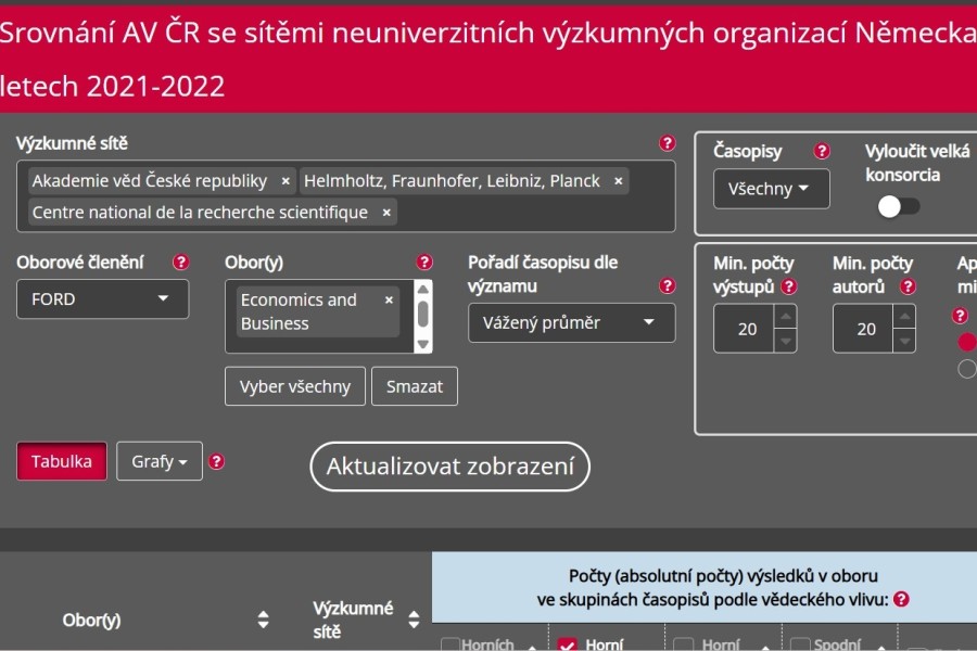 Think-tank IDEA při CERGE-EI vydává unikátní bibliometrické srovnání vědeckých výsledků základního výzkumu Akademie věd České republiky s obdobnými sítěmi neuniverzitních výzkumných organizací v Německu a Francii. Analýza srovnává vědní obory — jejich personální velikost, publikační výkon a publikační produktivitu ve špičkových vědeckých časopisech. Srovnání je založeno na doprovodné a veřejně dostupné interaktivní on-line aplikaci.