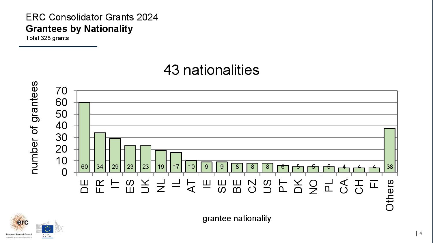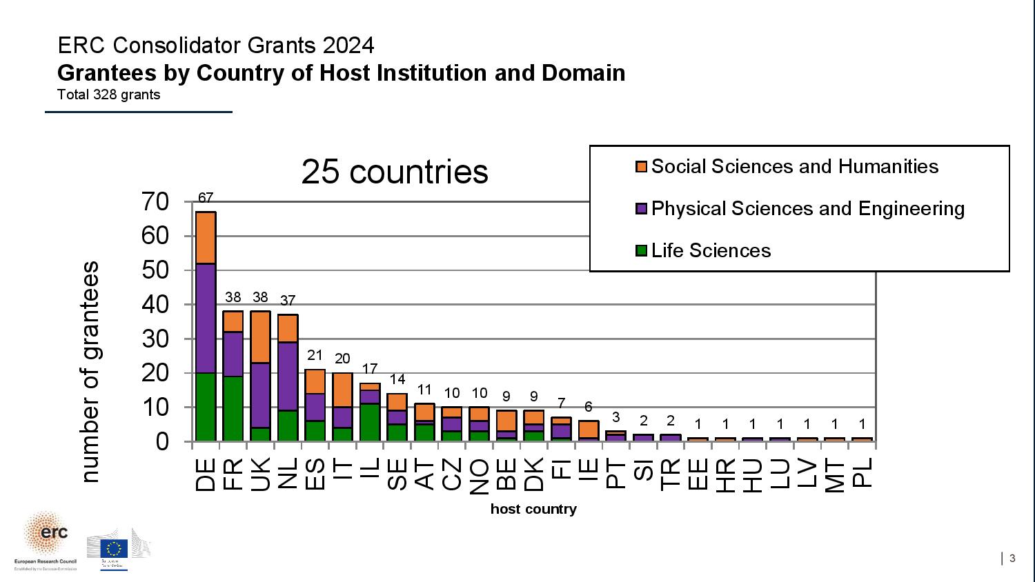 Celkově udělila ERC 328 grantů za 678 milionů eur. Předsedkyně Evropské rady pro výzkum Maria Leptin k výsledkům uvedla: „Gratulujeme všem vědcům, kteří v tomto posledním kole pro střední fázi kariéry získali konsolidační granty ERC. I když jsme letos měli k dispozici prostředky na podporu více uchazečů než v roce 2023, stále zůstává skutečností, že mnoho žadatelů, kteří byli v této soutěži hodnoceni jako vynikající, nebude financováno kvůli nedostatku rozpočtu. Toto plýtvání talentem lze řešit pouze zvýšením investic do základního výzkumu v Evropě.“ (v roce 2023 udělila ERC 308 grantů za 628 milionů eur, pozn. red.)