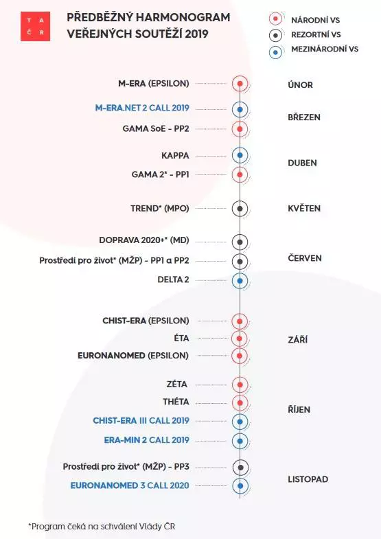 TA ČR letos v únoru plánuje vyhlásit další veřejnou soutěž v podprogramu M-ERA programu EPSILON, v březnu pak M-ERA Joint Call 2019 a další veřejnou soutěž v podprogramu 3 programu GAMA, který se zaměřuje na podporu transferu výsledků vědecké práce. V dubnu 2019 bude vyhlášena soutěž v programu KAPPA, který je zaměřen na podporu aplikovaného výzkumu, experimentálního vývoje a inovací z financí fondů EHP a Norska, a dále další soutěž v programu GAMA 2, podprogramu 1.