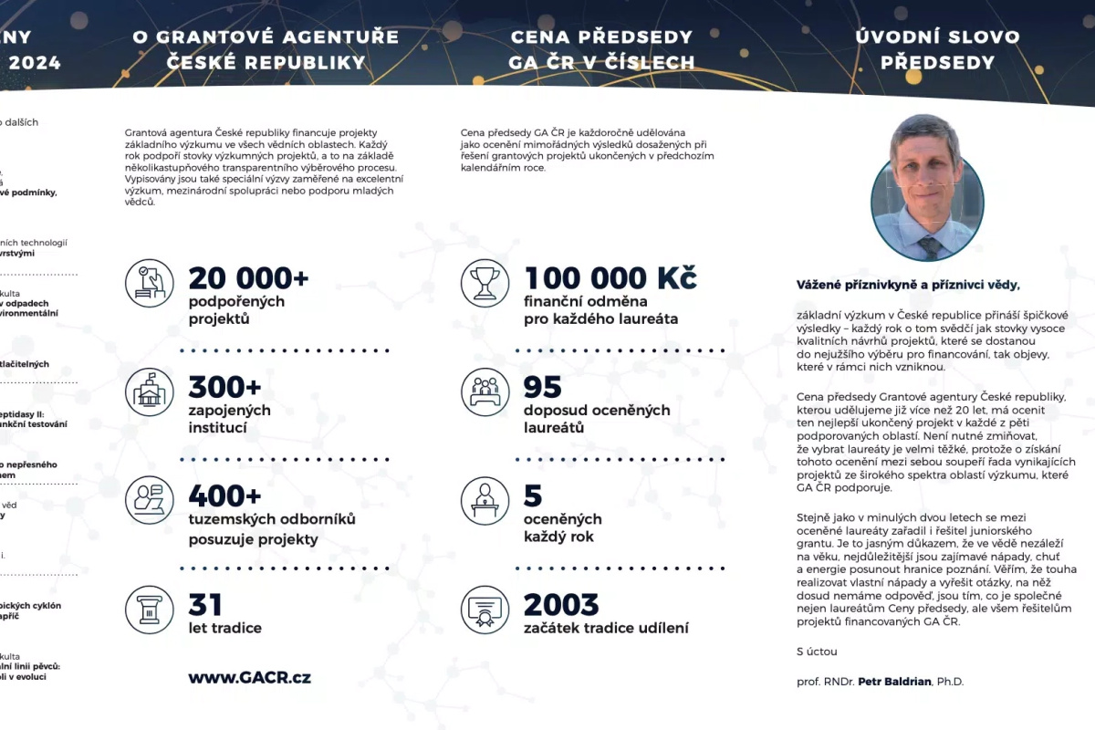Předseda Grantové agentury České republiky (GA ČR) Petr Baldrian v úterý 8. 10. 2024 ve Strahovském klášteře ocenil pět nejlepších vědeckých projektů. Oceněný základní výzkum přispěl k významnému prohloubení znalostí v daných disciplínách a otevřel cestu k jejich dalšímu praktickému využití.