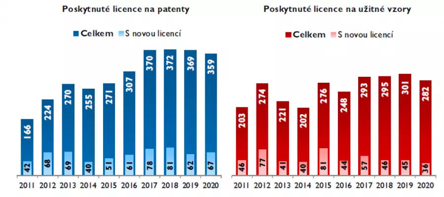 I když počet poskytovatelů patentů vzrostl, počet nově uzavřených licencí na patenty v roce 2020 klesnul. Na přijatých poplatcích se sice vybralo o čtyřicet procent více peněz než v předchozím roce, výrazný nárůst příjmů z licenčních poplatků je však ovlivněn činností Ústavu organické chemie a biochemie Akademie věd ČR, na který dlouhodobě připadá drtivá většina z celkové sumy získaných licenčních poplatků v ČR. Souhrnné licenční příjmy za ostatní subjekty zaznamenaly meziroční pokles o 13 %.
