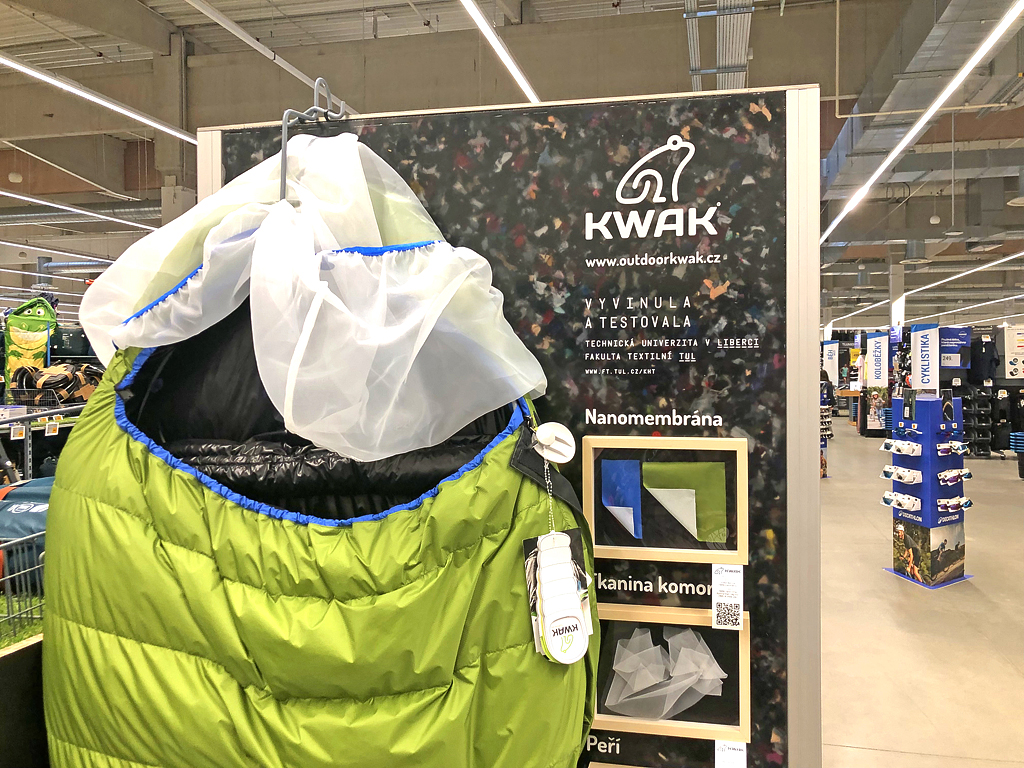 Spacáky s nanomembránou značky KWAK se právě v tyto dny dostávají do sítě prodejen Decathlon, největšího světového prodejce sportovního oblečení a vybavení. Membránu spacáků vyvíjeli specialisté z Katedry hodnocení textilií Fakulty textilní Technické univerzity v Liberci.