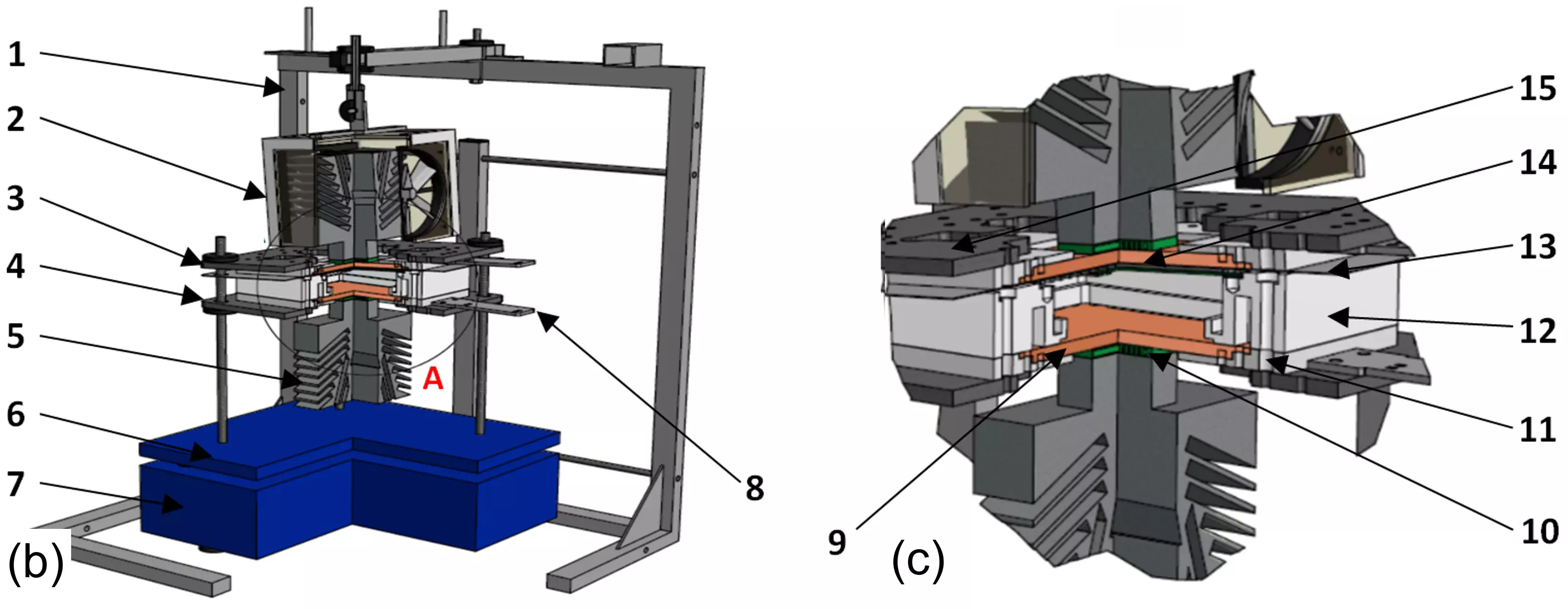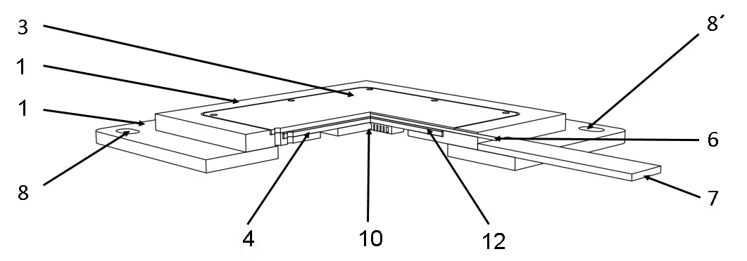 Podstata řešení (viz níže uvedený obr. a) spočívá v tom, že v rámu (1) jsou fixovány tepelně vodivé desky (3,4) s minimálním půdorysným rozměrem 100 mm, např. až 200 x 200 mm, zhotovené z kovu o tepelné vodivosti λ1 100 až 401 W•m−1•K−1, jako je měď, hliník nebo mosaz. Tyto vodivé desky jsou vzájemně odděleny blokační vrstvou (12) na bázi tepelně vodivého polymerního materiálu ze skupiny zahrnující vysoce plněné silikonové a polyuretanové pryže s tepelnou vodivostí λ2 0,5 až 5 W•m−1•K−1. Ke spodní tepelně vodivé desce je pak připojen maloplošný topný a/nebo chladící prvek – Peltierův článek (10) s půdorysnými rozměry nepřesahujícími 60 mm. Laboratorní plocha byla prakticky využita na zařízení vytvořeném ve spolupráci s firmou Contipro a.s. (viz níže uvedené obr. b,c).