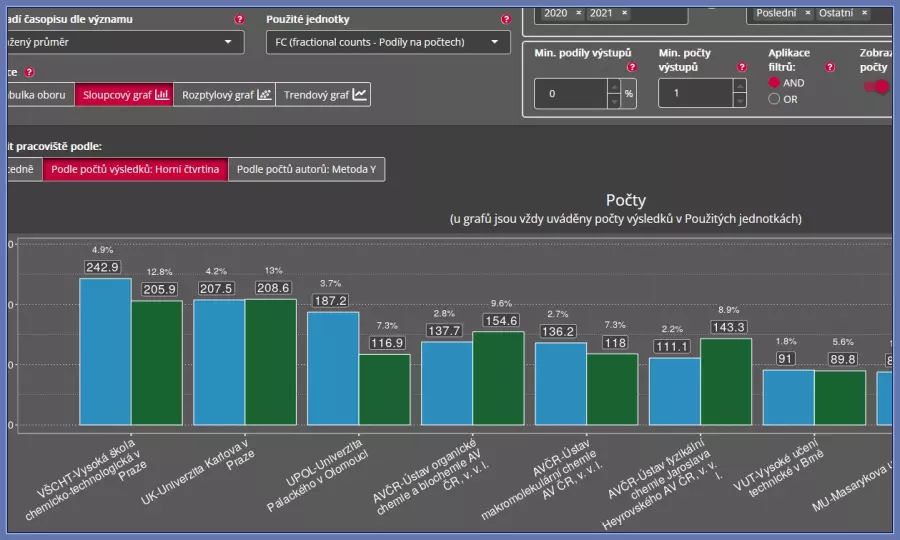 O naší aplikaci jsem zde psal již v minulosti. Abych se neopakoval, soustředím se na novinky letošní aktualizace: (i) doplnění dat za rok 2021, (ii) protažení časových řad pracovišť zpět až do roku 2008 (ano, před zavedením kafemlejnku), (iii) několik drobnějších poladění.