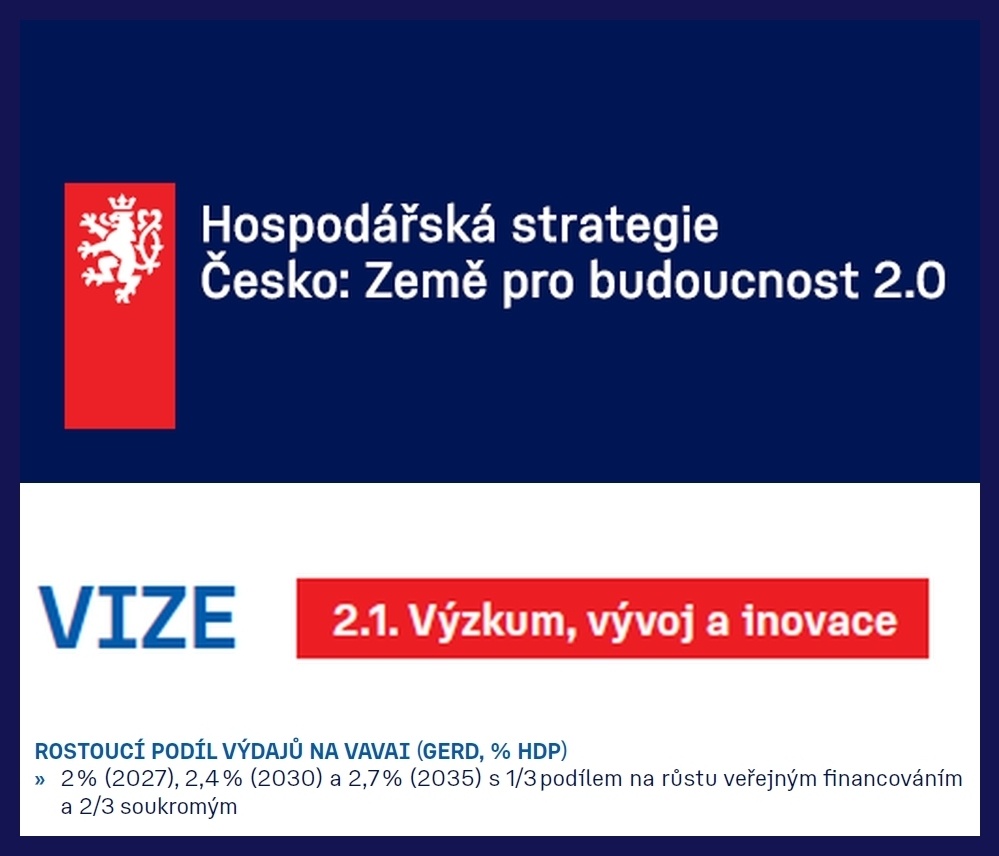 Hospodářská strategie: Česko země budoucnosti 2.0: Aktuální systém financování v ČR je výrazně orientován na granty s nedostatečnou institucionální a nepřímou podporou, což komplikuje dlouhodobé plánování a stabilitu výzkumných organizací.... Zvýšíme výdaje na VaVaI (GERD, % HDP) na 2 % (2027), 2,4 % (2030) a 2,7 % (2035) s 1/3 podílem na růstu veřejným financováním a 2/3 soukromým.