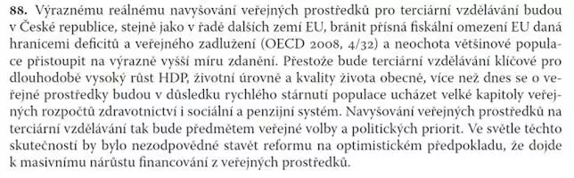 Zapomíná přitom však na tři důležité věci: (i) Že se o veřejné peníze budou muset VVŠ přetahovat s jinými rozpočtovými kapitolami, a že peněz pro VVŠ bude málo, bylo jasné už před deseti lety; (ii) Rozpočtové priority země jsou výsledkem demokratické volby společnosti a ty jsou zřejmě jiné než podpora VVŠ; (iii) VVŠ mají vůči společnosti a daňovým poplatníkům velký reformní informační dluh, na kterém však stále nechtějí nic moc měnit.